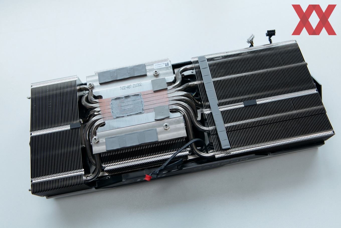 Über sechs Heatpipes wird die Abwärme der GPU im Kühlkörper verteilt. Die Heatpipes sind flach geschliffen und nehmen direkt Kontakt mit der GPU auf. Die Spalte zwischen den Heatpipes sind möglichst klein gehalten, denn durch sie wird die Kontaktfläche verringert. Im Rahmen der Messungen werden wir sehen, ob diese Konstruktion mit der Abwärme der Radeon RX 6900 XT umgehen kann.