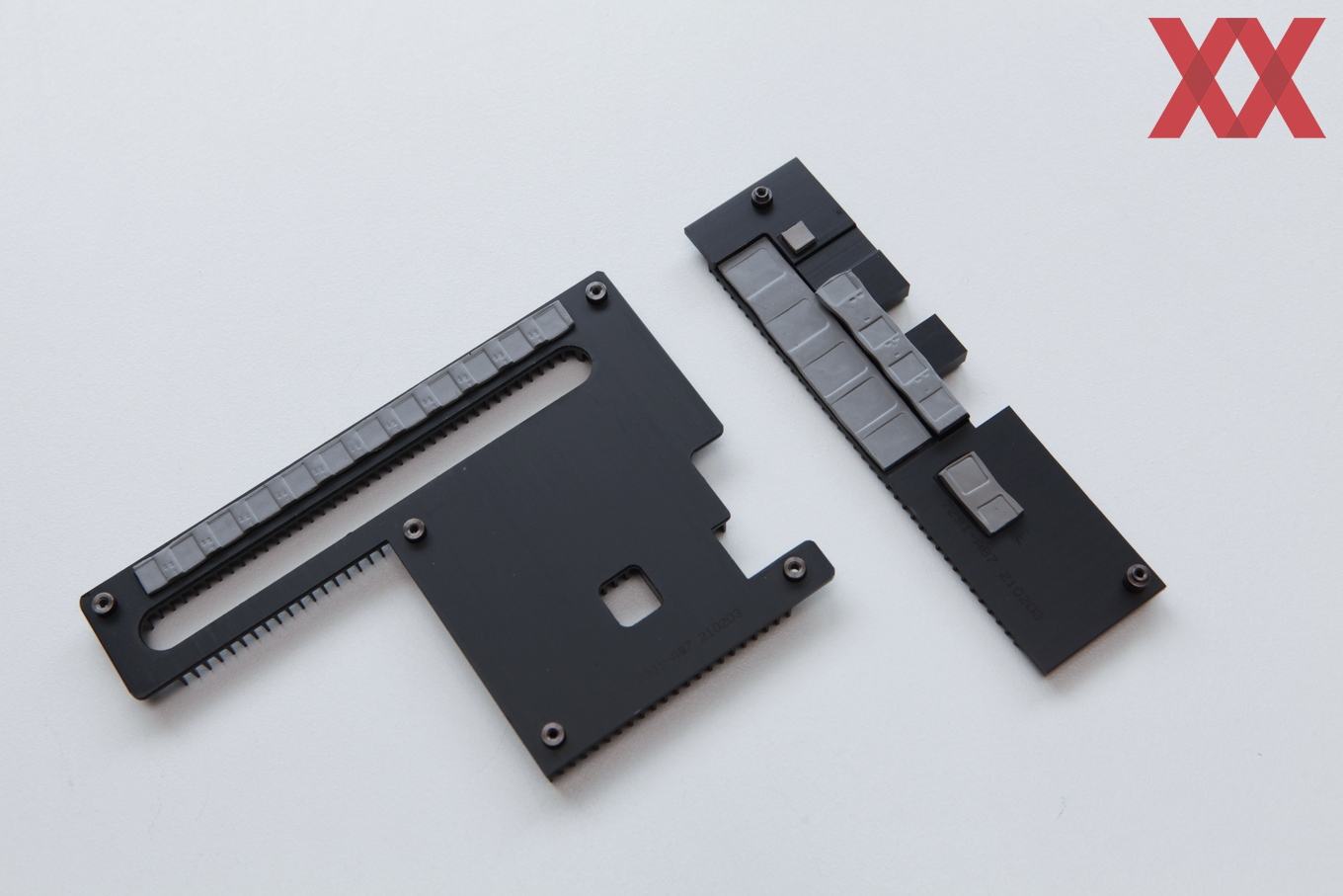 Die beiden kleinen Zusatzkühler auf der Spannungsversorgung bestehen aus Aluminium und sind mit Wärmeleitpads versehen. Über zwei bzw. drei Schrauben sind sie durch das PCB mit der Backplate verbunden und bauen den notwendigen Anpressdruck auf. Die Backplate besitzt ebenfalls Wärmeleitpads. Diese sollen im rückseitigen Bereich der Spannungsversorgung sowie der GDDR6-Speicherchips dabei helfen, die Abwärme aus dem PCB zu transportieren.