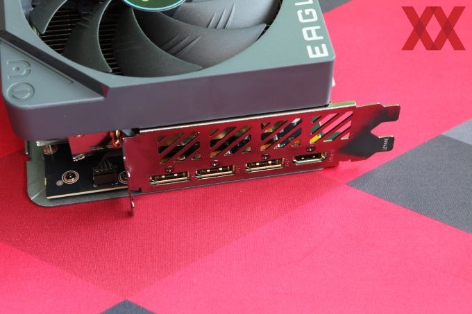 Auf der Slotblende gibt es die Standard-Konfiguration: Dreimal DisplayPort 1.4a und einmal HDMI 2.1a. An dieser Stelle gut zu erkennen ist die Tatsache, dass es sich bei der Abdeckung über dem Kühler um eine solche aus Plastik handelt. Zwar setzen auch anderen Hersteller an dieser Stelle auf Plastik, wissen dies aber besser zu kaschieren.