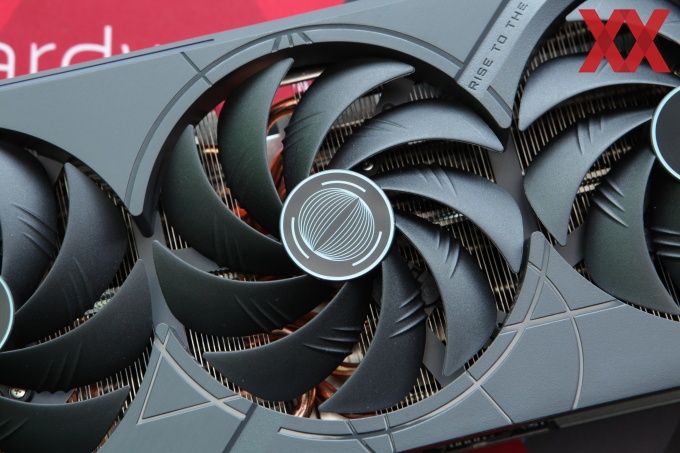 Die Axiallüfter mit einem Durchmesser von 110 mm beginnen erst ab einer GPU-Temperatur von 68 °C zu arbeiten. Wir haben eine maximale Drehzahl von 1.180 RPM gemessen. Lässt die Last wieder nach, schalten sich die Lüfter ab 52 °C wieder ab.
