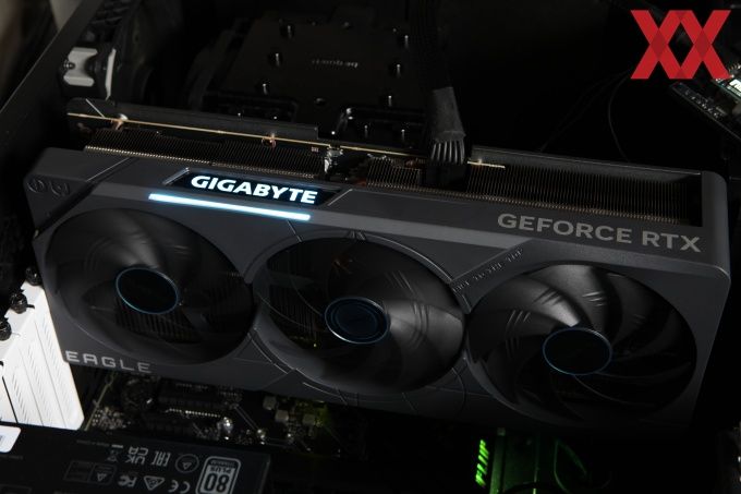 Einziges RGB-beleuchtetes Element sind der Gigabyte-Schriftzug sowie ein LED-Streifen auf der Stirnseite der Karte. Gigabyte bleibt dem zurückhaltenden Design in dieser Serie also treu.