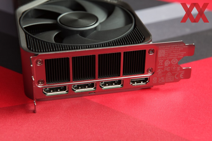 Die Slotblende nutzt NVIDIA zu gut zwei Dritteln dazu, dem vorderen Lüfter die Möglichkeit zu geben, etwas warme Luft auszublasen. Im verbleibenden Drittel sitzen vier Display-Ausgänge. Dies sind dreimal DisplayPort 1.4 und einmal HDMI 2.1.