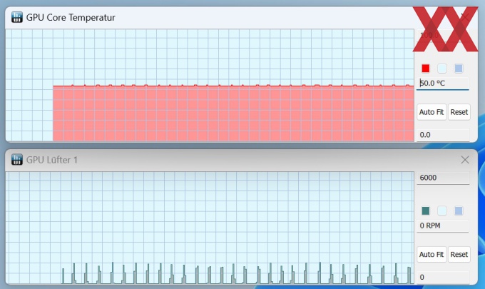 Nach einer gewissen Abkühlphase verbleibt die GPU-Temperatur bei 50 °C. Warum das so ist, werden wir nach der Betrachtung der Idle-Leistungsaufnahme sehen, denn so wirklich verbrauchsarm wird die Karte auch in diesem Zustand nicht. Zumindest erreicht sie so den Zustand, dass sie ihre Lüfter abschaltet.