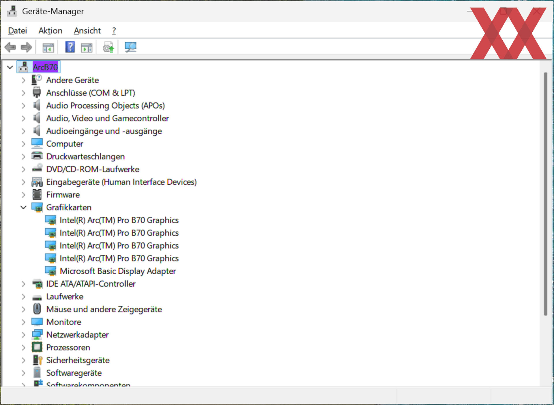 Uns standen aber nicht nur eine Arc Pro B70 zur Verfügung, sondern gleich vier. Entsprechend haben wir die Konfiguration mit einer, zwei und vier Karten testen können. Die Kühlung der Karten bzw. die Möglichkeit des Radiallüfters auch hinten anzusaugen, wird in einer solchen Konfiguration natürlich immer wichtiger.