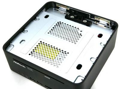 Auch wenn es auf den ersten Blick nicht so aussieht, AsRock gewährt seinen Käufern den vollen Zugriff auf das Innenleben des Vision 3D – neben der Anschlussvielfalt unterscheidet man sich also auch hier von Apple. Um erst einmal an das Innenleben zu kommen, muss eine Taste auf der Rückseite gedrückt, anschließend kann der Deckel abgenommen werden.