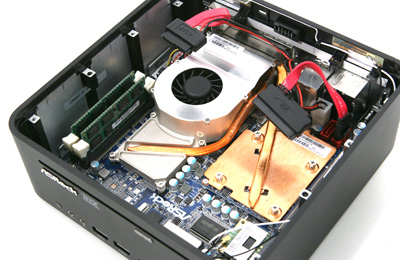 Noch eine Etage tiefer befindet sich das Motherboard. Hier ist gut zu erkennen, dass AsRock ein Modell mit zwei Speicherslots verbaut. In der uns vorliegenden 4-GB-Konfiguration sind entsprechend beide Bänke belegt.