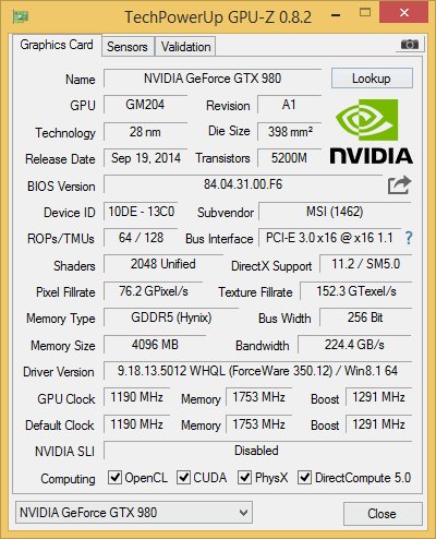 Um die Grafikleistung kümmert sich hingegen eine MSI GeForce GTX 980 Gaming. Auch sie wurde im Vergleich zur NVIDIA-Referenz etwas übertaktet. Während die kalifornische Grafikschmiede Taktraten von 1.126/1.216/1.750 MHz vorsieht, lässt MSI sein Modell mit 1.190/1.291/1.750 MHz arbeiten. Über die hauseigene Gaming-App ließen sich sogar noch höhere Taktraten freischalten, diese war auf unserem Testsystem jedoch nicht ab Werk installiert. Wer noch ein bisschen mehr aus dem System herausholen möchte, der kann dies sorgenfrei über die MSI-App tun, dann rechnet die MSI GeForce GTX 980 Gaming mit 1.216/1.317/1.750 MHz noch einmal etwas schneller. Große Sprünge sind damit aber nicht zu erwarten. Im normalen 2D-Betrieb schalten sich die beiden Lüfter bis zum Erreichen einer Chiptemperatur von etwa 60 °C komplett ab - der Pixelschubser wird damit lautlos auf Temperatur gehalten. Doch auch unter Last bleibt das Modell angenehm leise, wie unser Testbericht zur MSI GeForce GTX 980 Gaming aufzeigte. Die Grafikkarte ist also ein kleines Highlight, verbauen viele Hersteller lediglich die günstigsten Modelle mit Referenzkühler.
