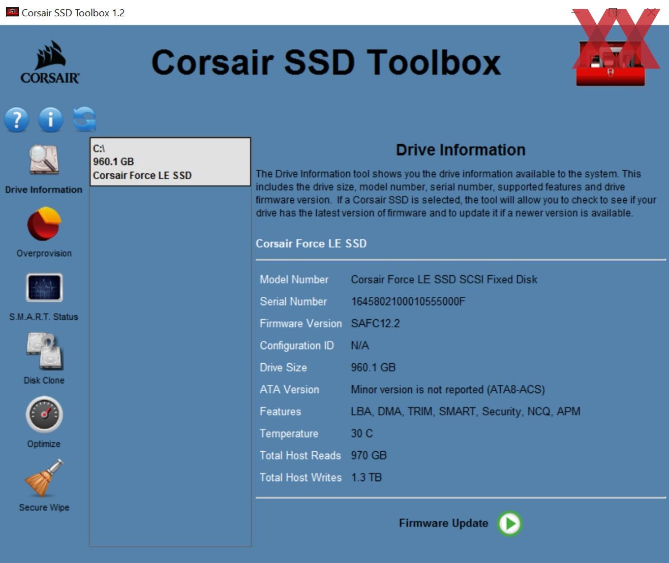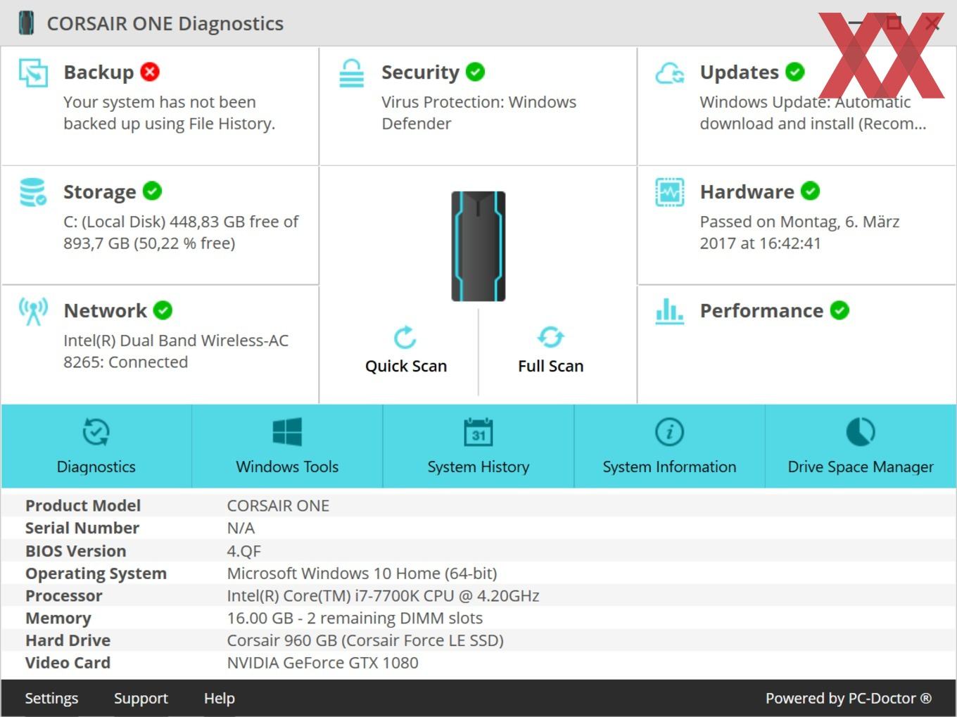 "Corsair One Diagnostics" gibt einen Überblick über den aktuellen Software-Status des Komplettrechners. Das Tool informiert darüber, wann das letzte Backup angefertigt, die letzten Updates installiert wurden und welche Geschwindigkeiten im Netzwerk erreicht werden. Für die SSD ist ebenfalls ein eigenes Tool installiert. Die Toolbox erlaubt unter anderem eine schnelle Garbage-Collection über einen einzigen Klick, ermöglicht ein sicheres Löschen der Daten und informiert über die SMART-Werte. Die meisten Features sind bei einem Systemlaufwerk wie eben bei der Webshop-Edition des Corsair One Pro aber hinfällig.