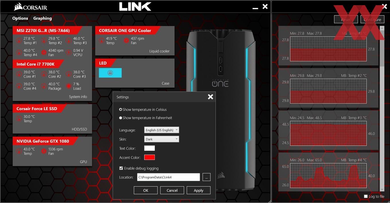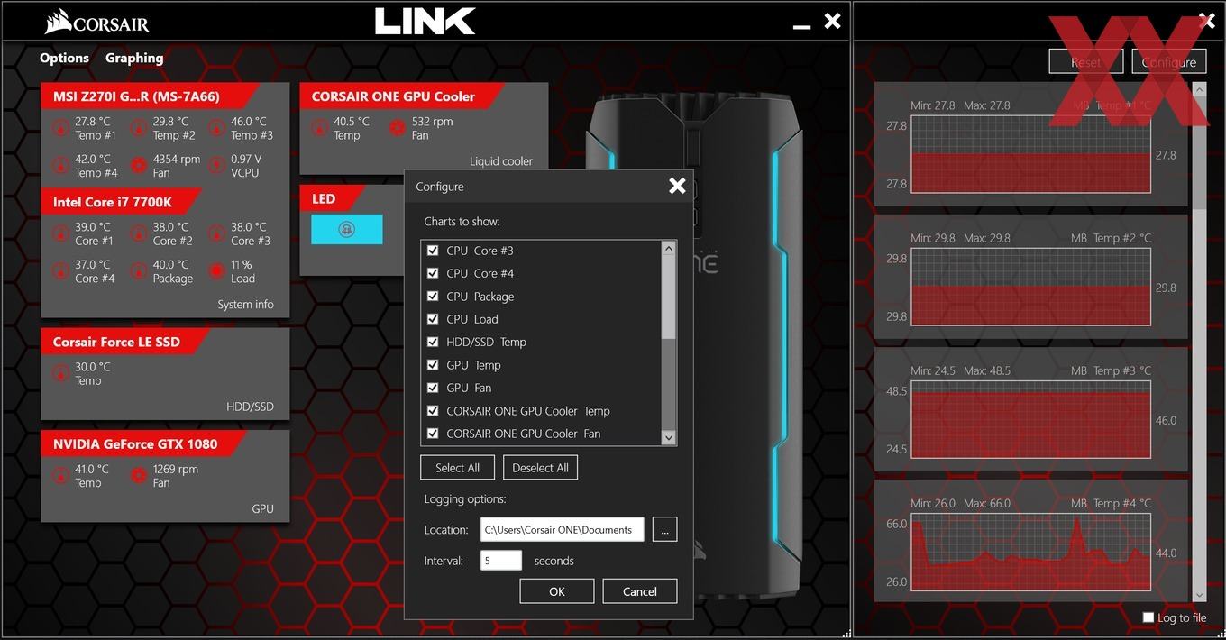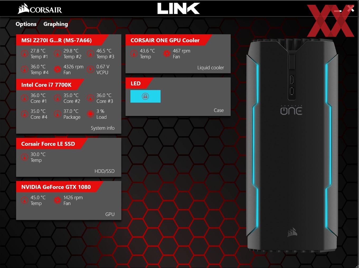 Eines vorne weg: Zwar sind viele Hersteller-Tools vorinstalliert, auf unnötige Demo-Versionen oder gar Bloatware aber hat Corsair bei seinem Corsair One dankenswert verzichtet. Mit dabei ist lediglich Software, die die Konfiguration des System-Aufbaus zentral zusammenbringt oder überhaupt erst möglich macht sowie die Treiber stets auf den neusten Stand bringt. Mit dabei ist unter anderem Corsair Link. Hier können alle wichtigen Parameter des Systems ausgelesen werden. Darunter beispielsweise die aktuelle Prozessor-Temperatur, die Lüftergeschwindigkeit im Gehäuse-Deckel, die Temperatur der SSD sowie natürlich die Temperatur und Lüftergeschwindigkeit der MSI-Grafikkarte. Ebenfalls mit Sensoren bestückt sind die beiden Wasserkühler auf CPU und GPU. Eine RGB-LED hat Corsair im Gehäuse nicht integriert. Die beiden Leuchtstreifen in der Front können lediglich weiß aufleuchten, immerhin lässt sich über die Sofware Effekt und Intensität bestimmen. Möglich ist ein dauerhaftes Aufleuchten oder ein Pulsieren. Corsair Link erlaubt obendrein die Lüfterkurven der beiden Lüfter anzupassen und entsprechend der Temperaturen zu regeln.