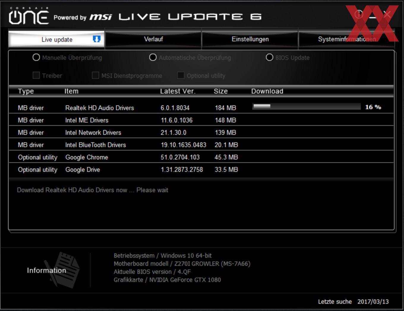 Über "MSI Live Update" können automatisch Updates für die Treiber, aber auch die Software-Tools des Corsair One über einen einzigen Klick installiert werden. Die Software sucht automatisch nach den richtigen Hardware-Treibern und installiert diese, sobald eine neue Versionen davon verfügbar ist, selbstständig.