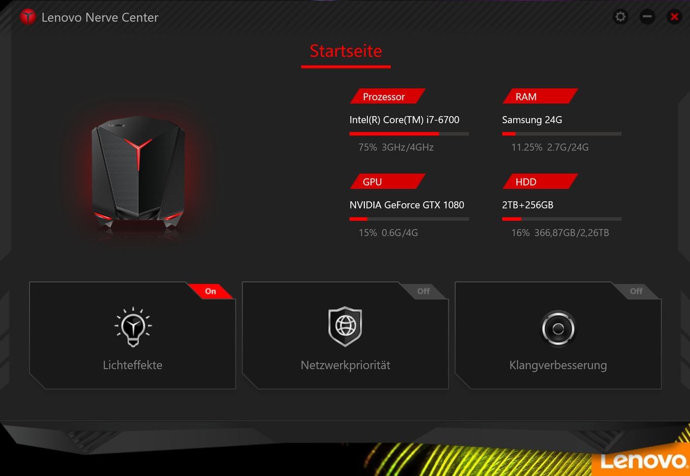 Über das "Lenovo Nerve Center" lässt sich hingegen die Beleuchtung einstellen. Diese wird in zwei Bereiche eingeteilt, deren LED-Helligkeit in drei Stufen unabhängig voneinander geregelt werden kann. Ein Farbwechsel oder ein Pulsieren ist jedoch nicht möglich – der ideacentre Y710 Cube setzt ausschließlich auf dauerhaft rot leuchtende LED-Streifen. Über den Reiter Netzwerkpriorität können Programme und Spiele ausgewählt werden, deren Netzwerk-Traffic bevorzugt behandelt werden soll. Ist eine Netzwerkverbindung aktiv, informiert die Software über die aktuellen Transferraten. Ansonsten werden die wichtigsten Angaben zum System gemacht. Hierzu zählen Speicherauslastung von SSD und HDD sowie Arbeitsspeicher und natürlich die Auslastung von CPU und Grafikkarte. Welche Hardware verbaut ist, wird ebenfalls übersichtlich dargestellt.