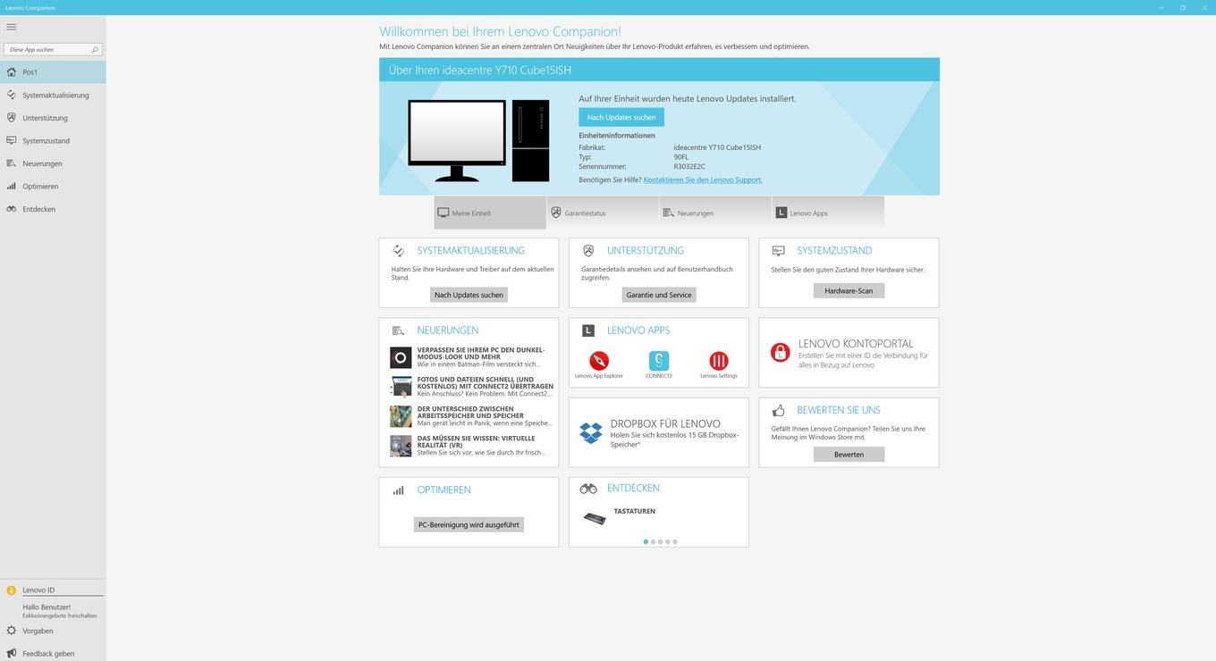Erfreulich ist, dass der Lenovo ideacentre Y710 Cube ohne unnötige Software-Programme oder gar Bloatware ausgeliefert wird – das war bei Lenovo vor einigen Jahren noch ganz anders. Die Installation von Windows 10 ist sauber, die wichtigsten Tools und Treiber für alle Komponenten sind installiert. Zur Konfiguration dienen lediglich zwei Tools. Über die "Lenovo Companion"-App lassen sich unter anderem die Treiber mit wenigen Klicks zusammensuchen und automatisch installieren. Ebenso macht die Software wichtige Angaben zum Garantiestatus, informiert mittels verschiedene Diagnosetests über den Systemzustand, listet neue Produkte von Lenovo auf und kann das System mit nur einem Klick optimieren. Dann werden unnötige Systemdateien gelöscht und kritische Updates installiert.