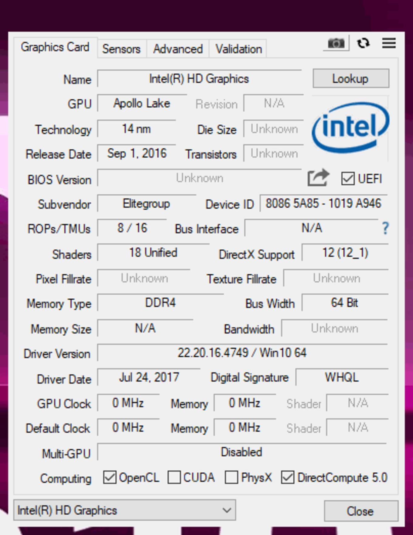 Davon profitiert auch die Grafiklösung, denn beim ECS Liva Q setzt man auf die integrierte Intel HD Graphics 500, welche bereits der neuen Grafikgeneration von Intel entspricht und so auch in den größeren Kaby-Lake-Prozessoren zum Einsatz kommt – dort aber natürlich mit deutlich höheren Geschwindigkeiten und mehr Rechenwerken. Im Falle des Intel Celeron N3350 gibt es zwölf Execution-Units, die sich maximal mit 650 MHz ans Werk machen. Das dürfte maximal für ältere Spieleklassiker genügen – da nützt es nichts, dass auch DirectX 12 unterstützt wird. Der Chip beschleunigt H.265-Material hardwareseitig.