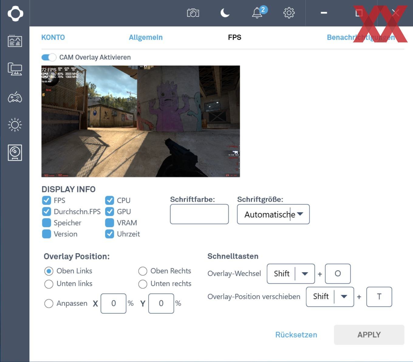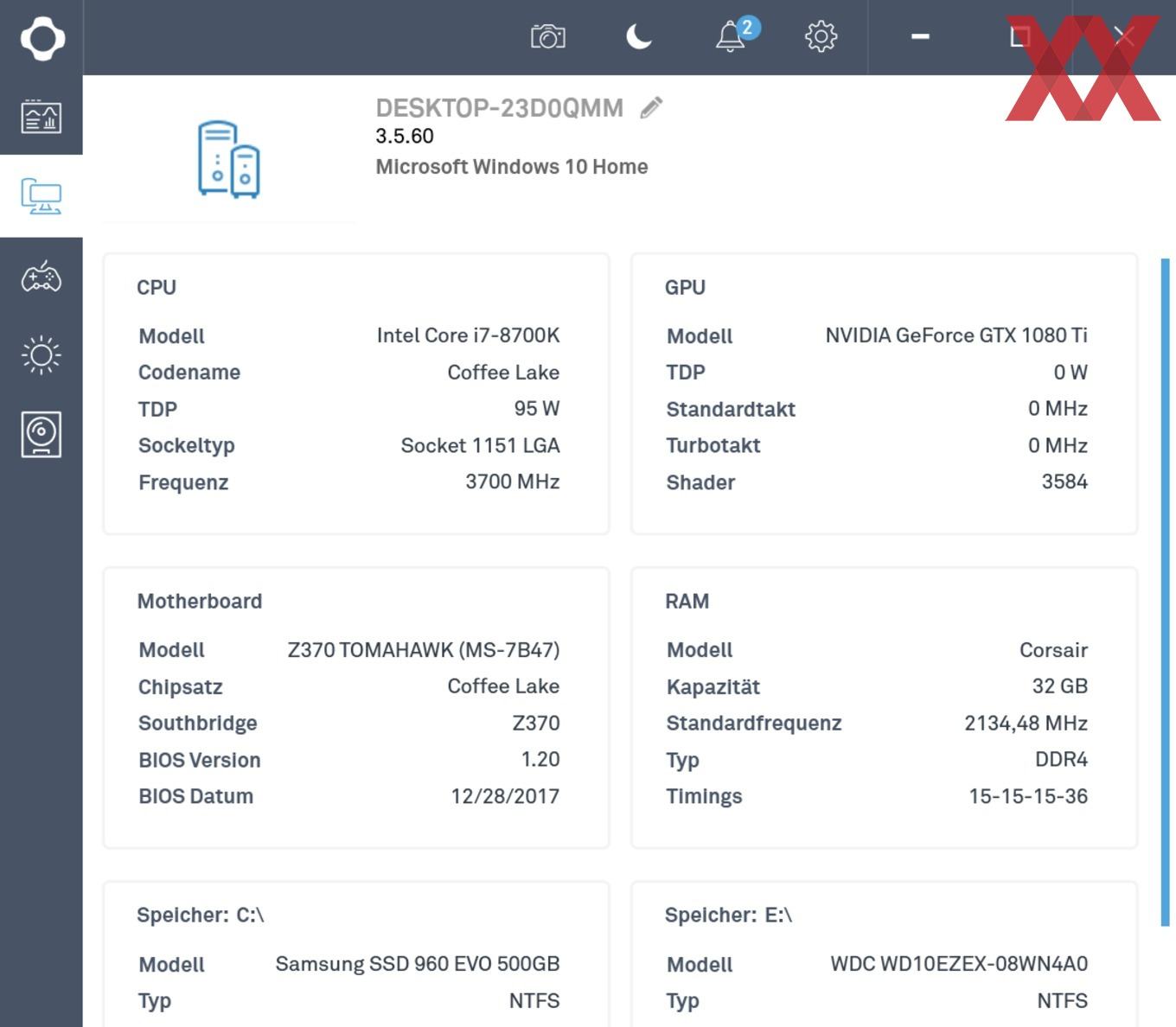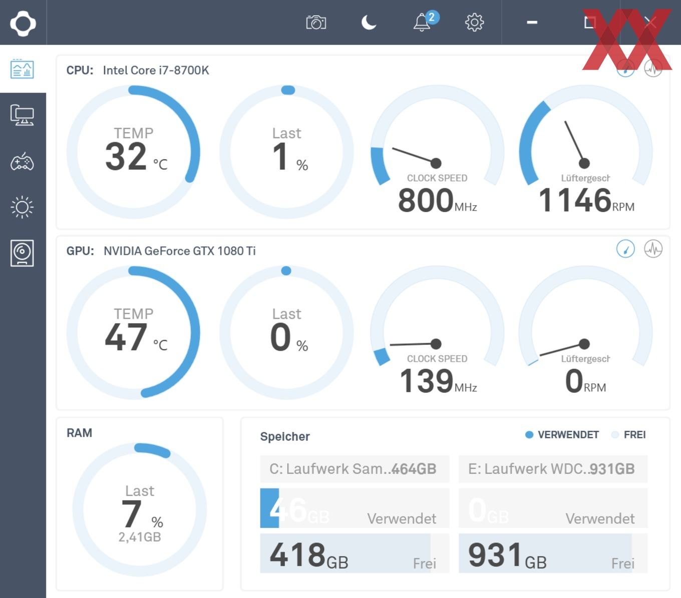 Sehr umfangreich ist die CAM-Software. Darüber lassen sich alle wichtigen Systemparameter auslesen. Dazu zählen CPU- und GPU-Auslastung, Temperatur, die anliegenden Taktraten und die dazugehörige Drehzahl der Kühlsysteme. Die RAM- und Speicherauslastung kann ebenso ausgelesen werden, wie die genauen Hardware-Spezifikationen aller verbauten Komponenten. Das Beleuchtungssystem wird ebenfalls zentral gesteuert, einen FPS-Counter mit Zusatzinformationen wie CPU- und GPU-Auslastung ist ebenfalls integriert. Sehr nützlich um zu überprüfen, ob das Lieblingsspiel tatsächlich auch in der hohen 4K-Auflösung mit allen Spieledetails selbst in anspruchsvollen Spielszenen ruckelfreie Werte abliefert.