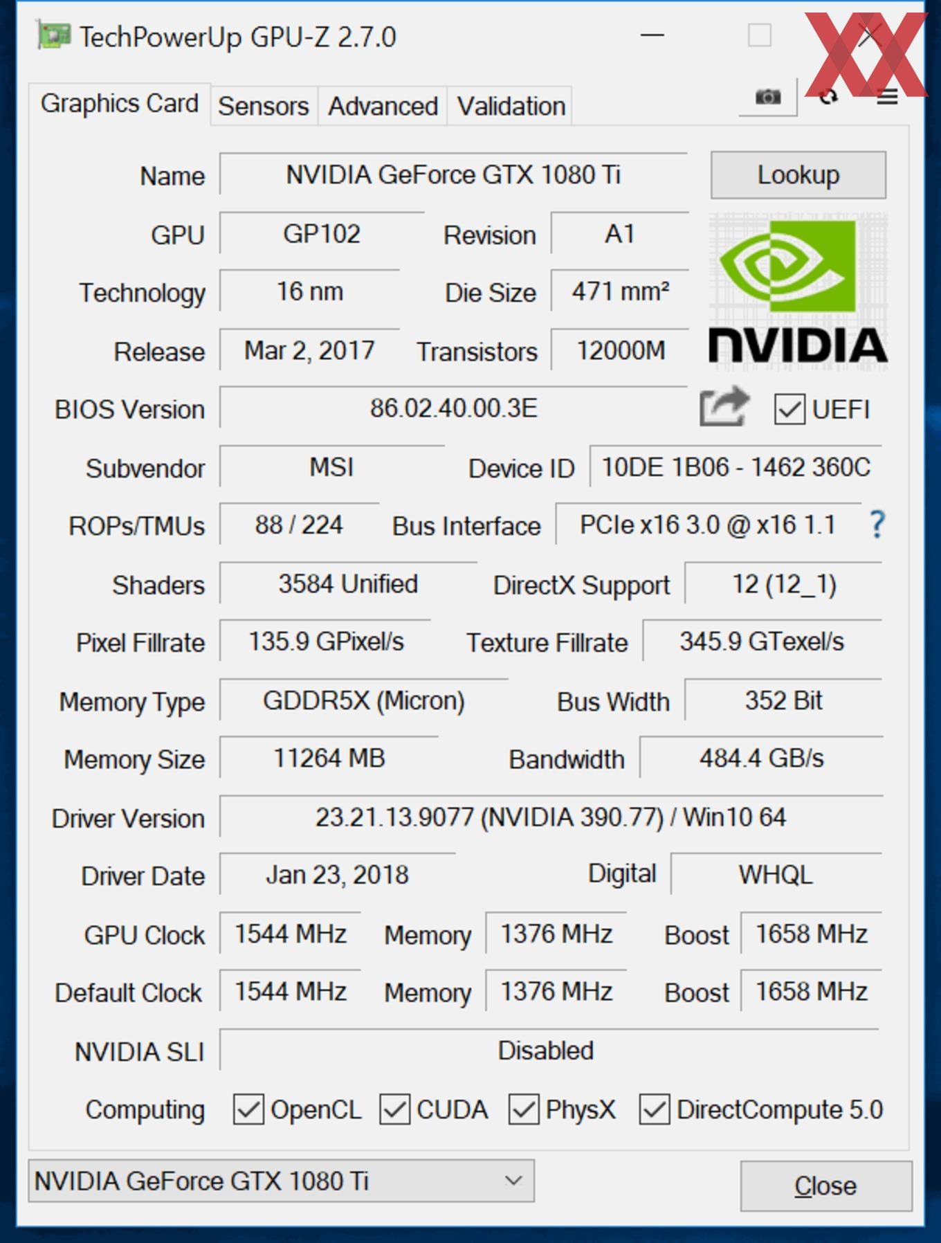 Das Speicherinterface ist gegenüber der GeForce GTX 1080 auf 352 Bit verbreitert worden und setzt sich somit aus elf 32-Bit-Controllern zusammen, an die schnelle GDDR5X-Chips mit einer Gesamtkapazität von 11 GB angebunden werden. Standardmäßig machen die sich mit einem Takt von 1.375 MHz ans Werk und erreichen so eine Bandbreite von theoretisch bis zu 484 GB/s.