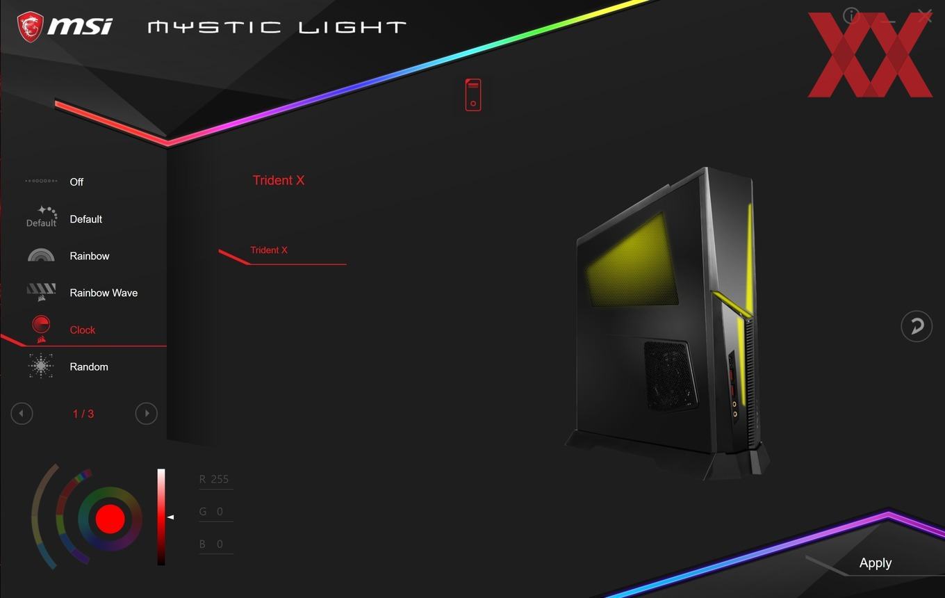 Die Mystic-Light-Beleuchtung des MSI Trident X wird über das gleichnamige Software-Tool konfiguriert. Möglich sind zahlreiche verschiedene Leuchteffekte und Farben, die teilweise in einzelnen Regionen eingeteilt werden. Beleuchtet werden beim MSI Trident X nicht nur der Ventus-Lüfter der Grafikkarte und der CPU-Kühler, sondern auch die Front.
