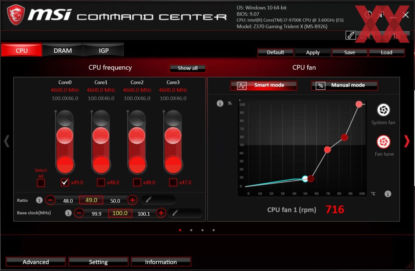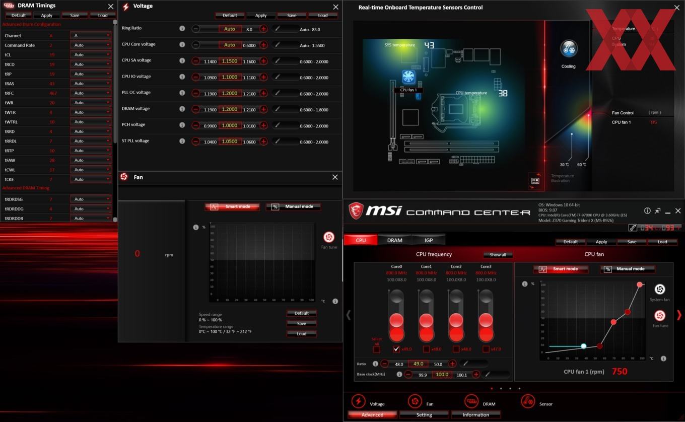 Neben Windows 10 Home in der 64-Bit-Version sind eine Reihe weiterer Tools ab Werk installiert. Besonders nützlich ist das hauseigene Command Center. Dieses listet nicht nur die aktuelle Auslastung und Geschwindigkeiten der einzelnen Prozessor-Kerne des Intel Core i7-9700K auf, sondern kann auch deren Temperatur auslesen und die Lüftergeschwindigkeit manuell anpassen. Außerdem kann Einfluss auf die einzelnen Spannungen für Speicher und CPU genommen, genau wie verschiedene weitere Sensoren ausgelesen werden. Die listet die Software im Übrigen grafisch übersichtlich auf und zeigt die einzelnen Temperatur-Bereiche auf einer Mainboard-Grafik an.