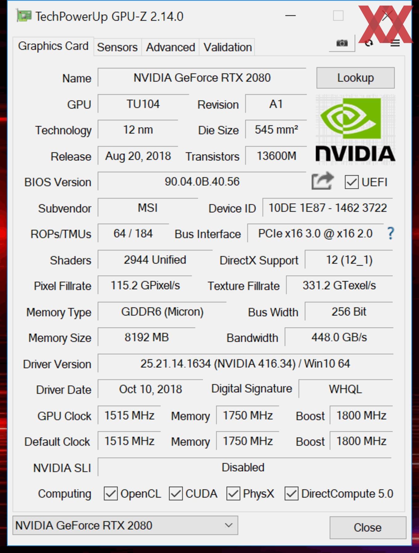 Unter der Haube gibt es den neuen TU104-Chip, welcher bereits der taufrischen Turing-Architektur entspringt und im fortschrittlichen 12-nm-Prozess gefertigt wird. Er stellt insgesamt 2.944 Shadereinheiten bereit und kann auf einen 8 GB großen GDDR6-Videospeicher samt 256-Bit-Interface zurückgreifen. Zusammen mit Taktraten von 1.750 MHz kann der 3D-Beschleuniger so eine Speicherbandbreite von theoretisch 448 GB/s erreichen. Der Grafikprozessor macht sich hingegen mit einem Basis- und Boost-Takt von 1.515, bzw. mindestens 1.800 MHz ans Werk. In der Praxis erreicht unser Testgerät mühelos 1.890 MHz.