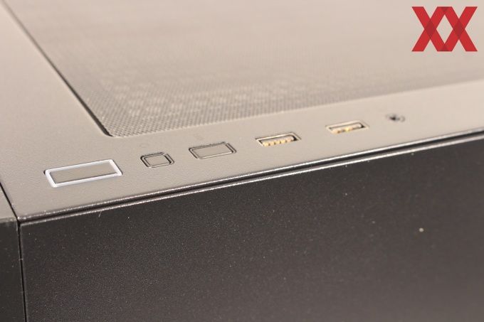 Oben, auf der rechten Seite bietet das Lian-Li-Case die I/O-Blende an und stellt darüber zwei USB-3.0-Schnittstellen nach Typ-A bereit und erlaubt den Anschluss von Kopfhörern über eine 3,5-mm-Klinkenbuchse. Die typischen Power- und Rest-Taster gibt es ebenfalls, wobei ein zusätzlicher, dritter Druckknopf vorhanden ist. Über ihn kann die RGB-Beleuchtung der beiden Frontlüfter durch verschiedene, vorgefertigte Profile gesteuert werden. Neben dem standardmäßigen Regenbogenmodus sind eine einfarbige Beleuchtung oder ein stetiger Wechsel der Farbe möglich.