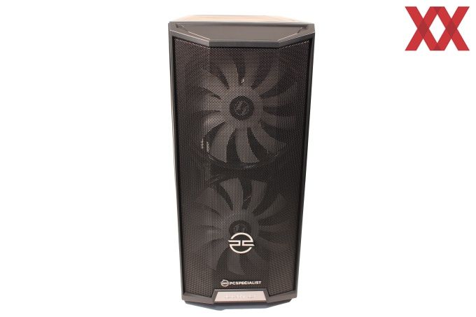 Die beiden Frontlüfter leuchten im Betrieb regenbogenfarbig auf, wobei diese Einstellung individualisiert werden kann. Im unteren Teilbereich der Front ist das Herstellerlogo von PCSpecialist gleich zweimal zu finden: Einmal als richtiges PCS-Logo und einmal zusätzlich ausgeschrieben direkt darunter. Ein Seitenteil aus Glas erlaubt außerdem einen Blick auf das Innere und damit auf die Hardware-Komponenten.