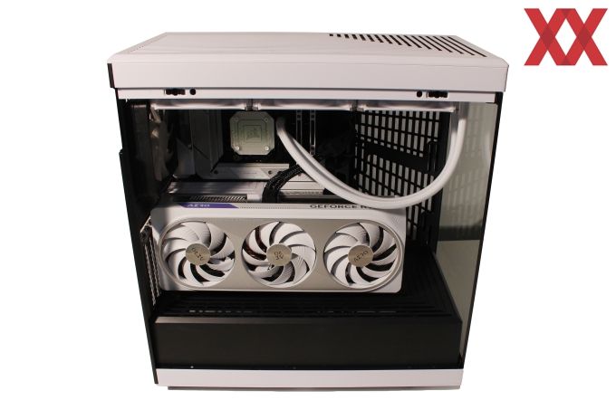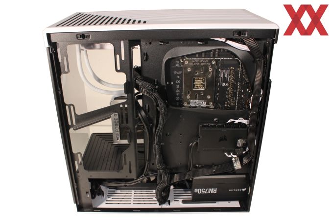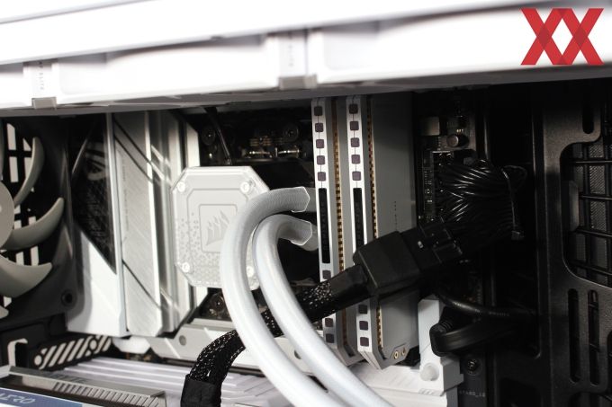 Der gläserne und sehr durchlässige Aufbau des PCSpecialist Luna Pro White, bzw. des Hyte Y40 macht ein sauberes Kabelmanagement im Inneren unabdingbar. Hier hat PCSpecialist ganze Arbeit geleistet, denn auf den ersten Blick erkennt man lediglich die beiden Schläuche der Wasserkühlung und die Stromversorgung der Grafikkarte, welche mittig über die Stirnseite realisiert wird. Die Stromversorgung für das Mainboard oder die zusätzlichen Lüfter am Gehäuse und auf dem Radiator werden durch nahegelegene Durchführungen über den Mainboardschlitten kurz und knapp durchgezogen, womit sie kaum auffallen.