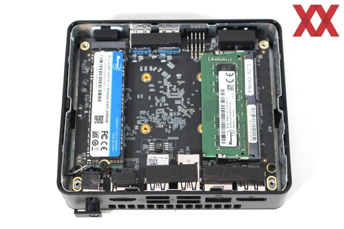 Auch die Mini-Air-Serie bietet Geekom nicht als Barebone an, sondern liefert diese komplett vorkonfiguriert mit unterschiedlichen Speicherausführungen aus. Der Geekom Mini Air12 Lite hat Speicher von Wodposit vorinstalliert. Zum einen ist das ein einzelnes DDR4-Modul mit 3.200 MHz und zum anderen eine SATA-SSD mit einer Kapazität von 256 GB. Letztere erreicht im Test gerade einmal Datenübertragungsraten von 451,8 MB/s lesend und 185,2 MB/s schreibend. Das ist doch vergleichsweise langsam. Theoretisch kann der Speicher aufgerüstet werden, ein NVMe-Modul lässt sich jedenfalls problemlos einsetzen.