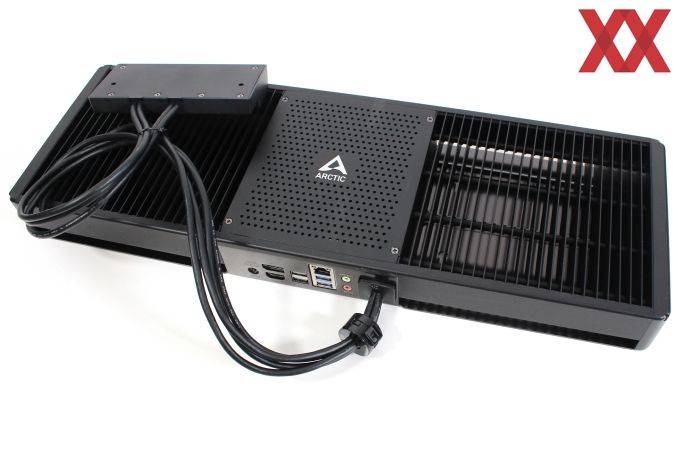 Der Arctic Senza verfolgt das Konzept, unterhalb der Schreibtischplatte montiert zu werden und setzt obendrein auf ein passives Kühlkonzept. So kommt das Hauptgerät auf Abmessungen von 536 x 180 x 50 mm (L x B x H) mm und wird über vier Schrauben direkt unter der Tischkante montiert. Die Hardware selbst befindet sich in einer separaten Kühlkammer in der Mitte, die links und rechts von zahlreichen Aluminiumfinnen sowie eloxierten Kupfer-Heatpipes umgeben ist, was die Oberfläche für die passive Kühlung vergrößert.