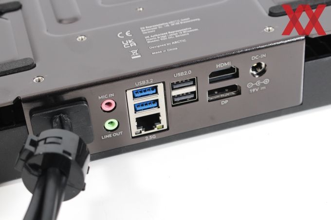 Ansonsten bietet die Rückseite nur noch zwei weitere 3,5-mm-Klinkenbuchsen für die Audioausgabe sowie die Netzteilbuchse für das externe 120-W-Netzteil an. Drahtlos wird nach WiFi 6E und Bluetooth 5.3 kommuniziert, wobei man RTL8125- und AX201-Chips einsetzt.