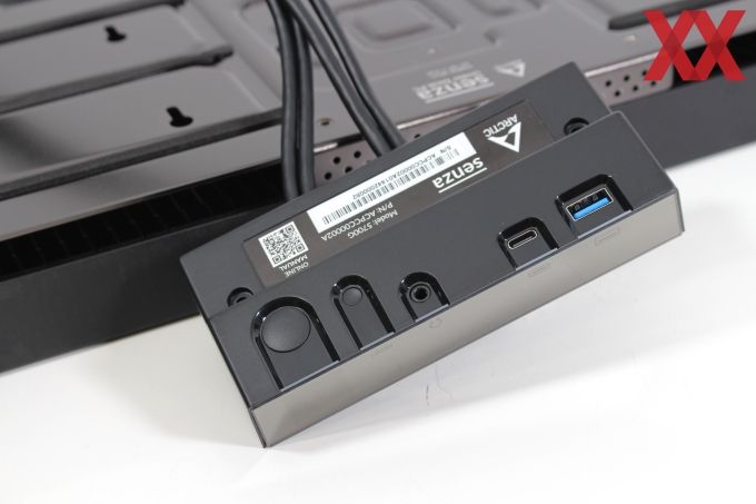 Das Panel stellt nicht nur einen Power- und Reset-Taster zur Verfügung, sondern erlaubt außerdem das schnelle Anstecken zweier USB-Geräte. Einmal USB 3.2 Gen2 Typ-A und einmal USB 3.2 Gen2 Typ-C stehen bereit, genau wie eine kombinierte 3,5-mm-Kinkenbuchse für den Anschluss von Kopfhörern. Die Anschlüsse befinden sich jedoch nicht an der Seite, sondern an der Unterseite, womit man stets unter den Schreibtisch klettern muss, um diese bedienen zu können. Dafür informiert ein gut sichtbares Arctic-Logo über den Betriebszustand des Senza.
