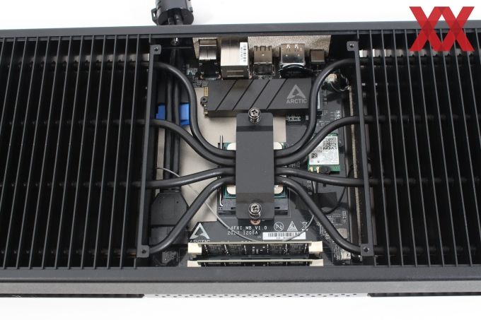 Über die mittig angebrachte Abdeckung mit dem Hersteller-Logo bekommt man einen einfachen und schnellen Zugriff auf die eigentliche Hardware des Arctic Senza 5700G. Sowohl die SSD als auch die beiden Speichermodule sind sehr einfach zugänglich und werden sogar nicht vom aufwendigen Heatpipe-System der Kühlung bedeckt. Die M.2-SSD, welche noch dem PCIe-3.0-Standard entspricht, ist ebenfalls mit einem zusätzlichen Passiv-Kühler von Arctic versehen worden, die DDR4-Speichermodule kommen ohne zusätzliche Kühlung aus.