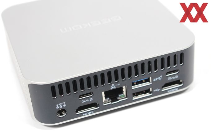 Den Großteil seiner Anschlüsse stellt der Kompaktrechner über die Rückseite bereit. Hier warten zwei zusätzliche USB-A-Ports auf ihre Verwendung, wobei eine für ältere Peripheriegeräte gedacht ist, da sie noch nach dem älteren 2.0-Standard entspricht. Dazu gibt es zwei Typ-C-Buchsen, die mit Blick auf den AMD-Unterbau maximal dem USB-4-Standard entsprechen, während der zweite Port per USB 3.2 Gen2 angebunden ist.