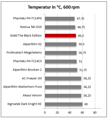 Der „The Black Edition“ kann sich erneut vor dem etwas größeren und schwereren Alpenföhn K2 platzieren, wird aber vom Alpenföhn Brocken 2 (den wir unlängst im Test hatten) um ein halbes Grad überholt.