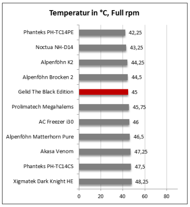 Bei voller Drehzahl fällt der „The Black Edition“ dann wieder in das obere Mittelfeld zurück und muss sich erneut dem Alpenföhn Brocken 2 und auch wieder dem Alpenföhn K2 knapp geschlagen geben.