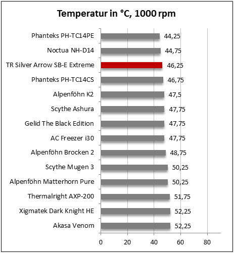 Bei 1000 Umdrehungen pro Minute zeigt sich ein sehr ähnliches Bild, der Thermalright Silver Arrow SB-E Extreme landet erneut auf der dritten Position des Testfeldes und kann sich noch nicht richtig in Szene setzen – sowohl der Phanteks PH-TC14PE als auch der Noctua NH-D14 sind knapp 2 °C kühler als unser Testkandidat.