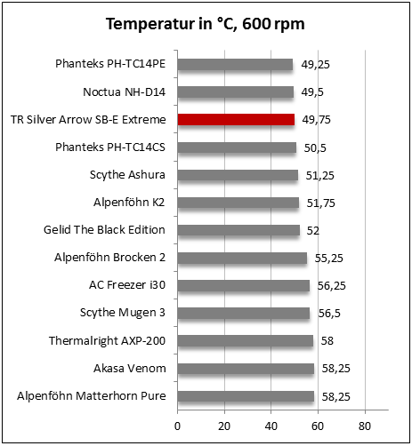 Der Silver Arrow SB-E Extreme kann sich bei 600 Umdrehungen pro Minute auf Platz 3 des Testfeldes einreihen. Vom ersten Platz, den immer noch der Phanteks PH_TC14PE belegt, trennt ihn aber nur ein halbes Grad °C. Interessant zu sehen ist, dass sich der Silver Arrow SB-E also auch auf alltagstaugliche und leise 600 Umdrehungen herunterregeln lässt und auch dort ein sehr gutes Ergebnis zeigt.