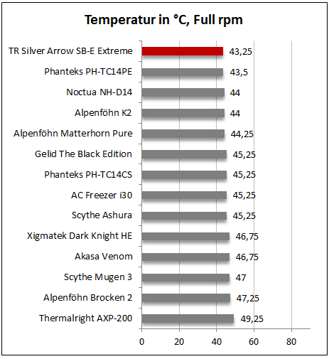 Bei voller Leistung, also maximaler Drehzahl der Lüfter, drehen die Serienlüfter unseres Testkandidaten mit 2468 Umdrehungen pro Minute so schnell wie bisher keine anderen. Entsprechend hoch fielen unsere Erwartungen bezüglich der Ergebnisse auch aus. Dem Silver Arrow SB-E Extreme gelingt es bei voller Drehzahl der Lüfter, wie zu erwarten war, tatsächlich auf den ersten Platz des Testfeldes vorzudringen – wenn auch mit 0,25 °C Differenz nur denkbar gering.