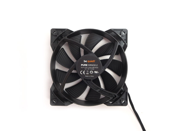 Als Serienlüfter legt be quiet! eine 120-mm-Version des be quiet! Pure Wings 2 PWM bei. Dieser läuft laut Herstellerangaben mit bis zu 1600 Umdrehungen pro Minute, (unser Modell schaffte bis zu 1750 Umdrehungen pro Minute) und erzeugt dabei einen Luftdurchsatz von bis zu 87 m³/h bei einer Lautstärke von bis zu 25,4 dB(A). Der Lüfter wird mit einem 4-Pin-PWM-Kabel am Mainboard oder einer Lüftersteuerung angeschlossen. Weiterhin liegen zwei Klammern dabei, mit denen der Lüfter am Kühlkörper des Shadow Rock 2 befestigt werden kann.