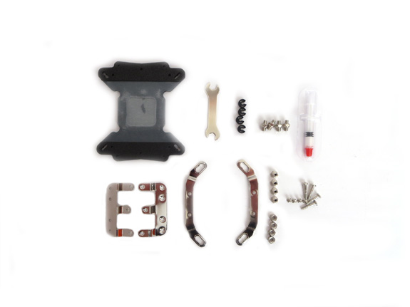 Weiterhin im Lieferumfang befinden sich das Montageset für Intel Sockel 775, 1150, 1155, 1366, 2011 sowie AMD Sockel AM2, AM2+, AM3, AM3+, FM1, FM2 und FM2, besagte Klammern zur Montage des Lüfters sowie eine kleine Tube unbekannter und unbeschrifteter Wärmeleitpaste. In diesem Test kommt allerdings, um die Vergleichbarkeit aller Kühler zu gewährleisten, natürlich unsere Referenzwärmeleitpaste – siehe Testsystem – zum Einsatz.