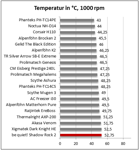 Unser Referenzlüfter kann das Ergebnis der Serienlüfter bei 1000 Umdrehungen pro Minute sogar um ganze 3,25 °C verbessern. Dennoch landet der be quiet! Shadow Rock 2, wenn auch diesmal etwas knapper, auf dem letzten Platz des Testfeldes.