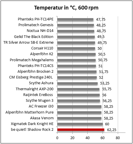 Der be quiet! Shadow Rock 2 landet, trotz 1,5 °C verbesserten Temperaturen durch unseren Referenzlüfter, erneut auf dem letzten Platz des Testfeldes.