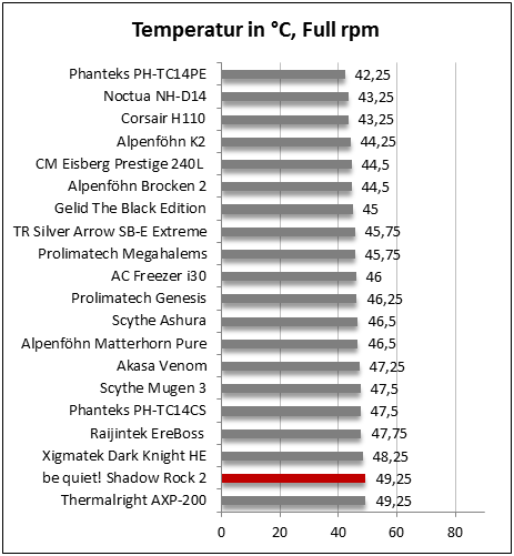 Auch bei voller Drehzahl, bei unseren Referenzlüfter sind das knapp 1450 Umdrehungen pro Minute, platziert sich der be quiet! Shadow Rock 2 ähnlich wie schon zuvor im Testszenario mit 1000 Umdrehungen pro Minute zusammen mit dem Thermalright AXP-200 auf dem letzten Platz des Testfeldes. Unsere Referenzlüfter erreicht hier, im Rahmen der Messgenauigkeit, dasselbe Ergebnis wie der Serienlüfter mit knapp 300 Umdrehungen pro Minute mehr.
