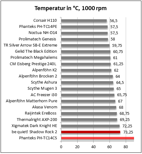 Bei 1000 Umdrehungen pro Minute verbessern sich die Temperaturen durch den Referenzlüfter, im Vergleich zum Serienlüfter, erneut um 3,25 °C – dies ändert aber nichts an der Positionierung des be quiet! Shadow Rock 2.