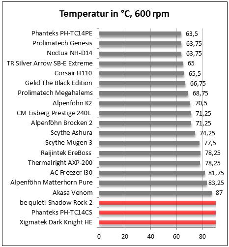 Mit 600 Umdrehungen pro Minute schaffte es der be quiet! Shadow Rock 2 auch mit Referenzlüfter leider nicht, unseren Intel Xeon E5 2678W noch innerhalb seiner thermischen Spezifikationen zu betreiben und die Kerntemperaturen stiegen über 90 °C, woraufhin wir den Test zum Schutz der CPU abbrachen.