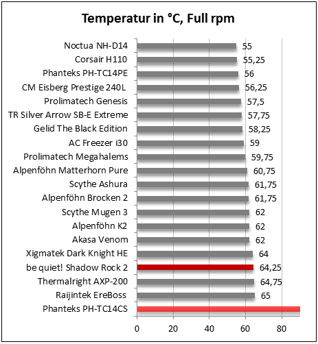 Bei voller Drehzahl unseres Referenzlüfters platziert sich der be quiet! Shadow Rock 2 ähnlich wie schon zuvor mit Serienlüfter.