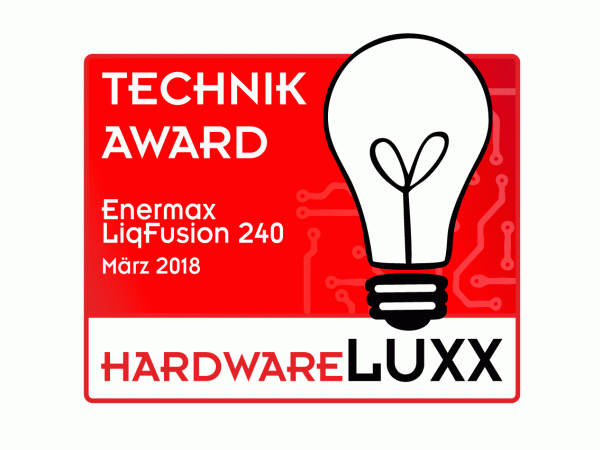 Weil Kühlleistung und Lautstärke (vor allem mit reduzierter Betriebsspannung an der Pumpe) schließlich auch überzeugen können, ist die Enermax LiqFusion 240 im direkten Vergleich die überzeugendere RGB-AiO-Kühlung. Dafür gehen auch die rund 20 Euro Aufpreis zur Aerocool P7-L240 in Ordnung. Insgesamt ist die LiqFusion 240 die bisher stimmigste AiO-Kühlung mit RGB-Beleuchtung, die wir testen konnten. Sie verdient sich deshalb unseren Technik-Award.