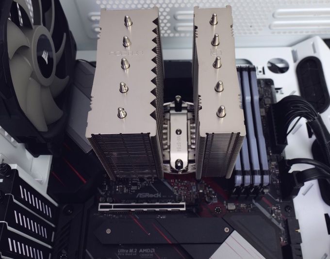 Mit Serienlüfter passt der NH-D12L problemlos auf das Testmainboard. Auch die RAM-Kompatibilität ist auf dem LGA1200-Board hervorragend. Anders sieht das allerdings aus, wenn noch ein zusätzlicher NF-A12x25r PWM vor dem vorderen Kühlturm montiert werden soll. Bei RAM-Riegeln mit höheren Heatspreadern muss dieser Lüfter weit nach oben versetzt werden. Das beeinträchtigt die Gehäusekompatibilität und dürfte auch dafür sorgen, dass der Zusatzlüfter weniger effektiv arbeitet als bei einer tieferen Position. Für die Messungen mit Zweitlüfter haben wir deshalb die Corsair Vengeance RGB Pro-Module durch Low-Profile-Speicher ersetzt. Damit kann der äußere Lüfter dann auf gleicher Höhe wie der innere Lüfter sitzen.