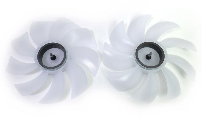 Die beiden unterschiedlichen Rotortypen unterscheiden sich deutlich bei der Ausrichtung der Rotorblätter. Zusätzlich versieht Thermaltake sie aber auch mit unterschiedlichen Logo-Stickern.