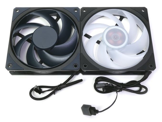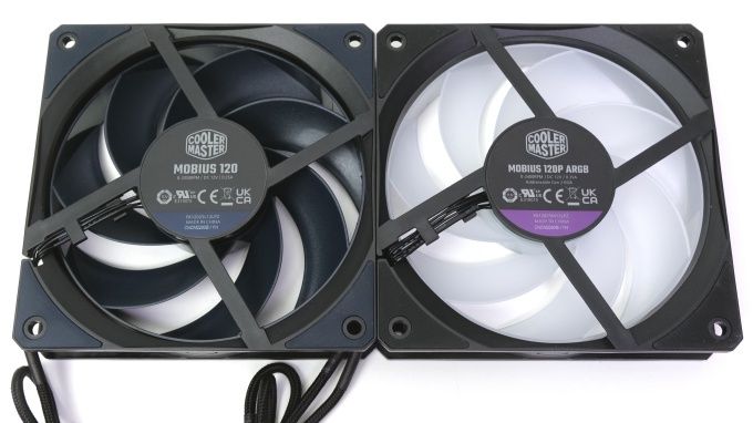 Im Bild zeigt sich links ein Mobius 120 und rechts ein Mobius 120P ARGB. Am unbeleuchteten Modell fällt auf, dass Rotor und Entkopplungsgummis leicht bläulich erscheinen. Beim A-RGB-Modell kommt ein transparenter Rotor zum Einsatz..