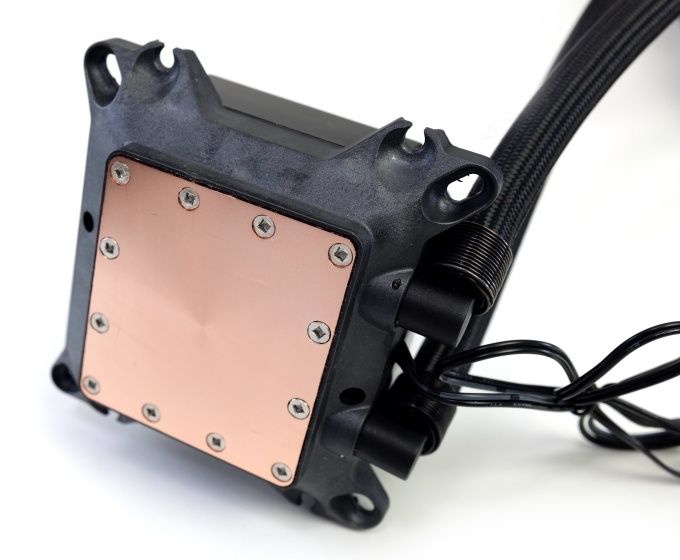 Am Kühler zeigt sich seitlich eine Kunststoffhalterung. Die Bodenplatte besteht aus Kupfer und misst etwa 5,8 x 5,3 cm, ist also rechteckig.
