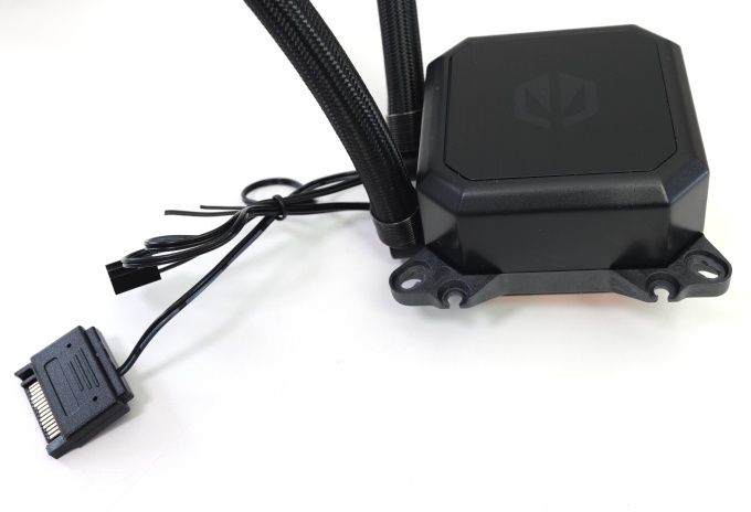 Die Pumpe sitzt in einem schwarzen Kunststoffgehäuse, in das eine Abdeckung aus gebürstetem und ebenfalls schwarzem Aluminium eingelassen ist. Zur Stromversorgung der Pumpe dient ein S-ATA-Stromanschluss. Die Pumpe lässt sich über einen PWM-Anschluss regeln. Ein Regulieren der Pumpendrehzahl ist von Endorfy auch ausdrücklich vorgesehen. Dabei gibt man einen Drehzahlbereich von 1.600 bis 2.600 U/min an. Am Testsystem konnten wir allerdings keine Drehzahl auslesen. Weil zudem vom Hersteller kein konkreter Regelbereich genannt wird, haben wir die Messungen vorsichtshalber mit einem PWM-Regelwert der Pumpe von 100 und 50 % durchgeführt und darauf verzichtet, die Pumpendrehzahl noch weiter zu reduzieren.